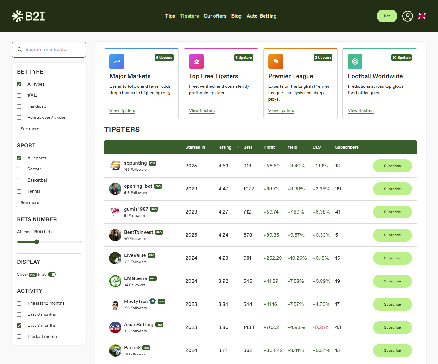 Follow high-performing, verified tipsters who meet Bet2Invest’s performance criteria — at least 400 predictions and a minimum 3% ROI.