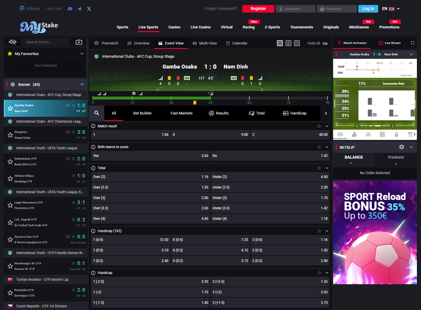 MyStake live betting interface with in-play football markets.